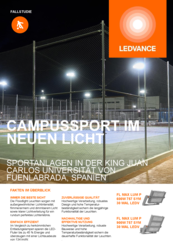Im Auftrag der König Juan Carlos Universität in Fuenlabrada hat LEDVANCE eine leistungsstarke und nachhaltig effiziente Beleuchtungslösung für elf Plätze der Außensportanlagen des Campus konzipiert und realisiert. Die insgesamt 64 LED-Flutlichtleuchten verbessern die Lichtqualität der Anlagen für die Sportler deutlich und überzeugen zudem durch robuste Bauweise, hohe Energieeffizienz und deutlich geringere Kosten und Aufwände bei der Wartung der Leuchten.